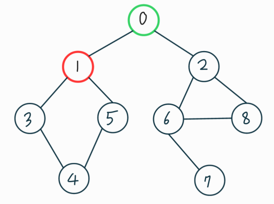 먼저 정점을 하나 선택한다. 선택된 정점의 인접란 정점 중에 아직 방문하지 않은 정점 중 하나를 선택해 방문한다. 위에서 설명했듯이 깊이 우선 탐색이므로 0에 인접한 1에 방문하였다면 그다음엔 1에 인접한 정점들이 우선적으로 탐색 되게 된다. 그래프를 보면서 알아보자. 빨간색은 현재 방문한 노드이고 초록색은 방문했던 노드입니다.