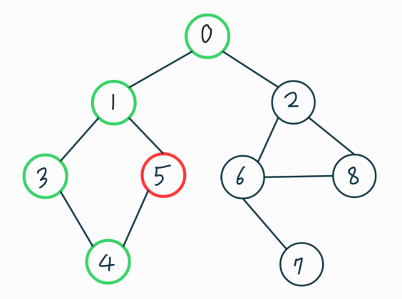맨 처음 방문한 0번 노드의 인접한 노드는 1, 2번이다. 이 중에서 더 작은 번호의 1번 노드를 방문했다(인접 리스트에 저장된 순서대로 방문). 이다음에는 2번이 아니라 1번에 인접하고 있는 0, 3, 5번 노드 중 하나를 방문할 건데, 0은 이미 방문을 했으므로 3, 5번 중에 방문하게 된다.