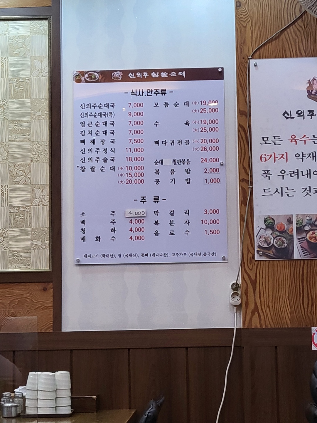 메뉴판이다. 개인적으로 신의주 순대국과 순대 철판 볶음을 좋아한다.
