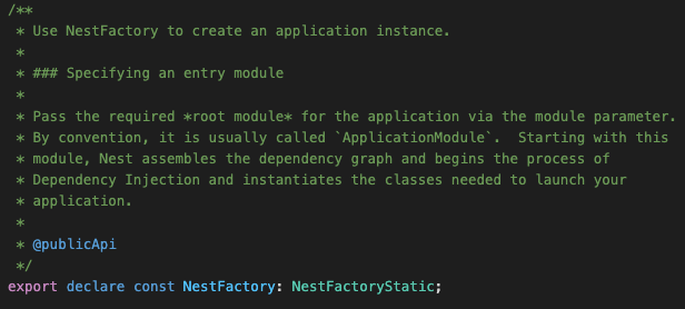 NestFactory를 확인해보면 root module을 전달받아 NestFactory는 응용프로그램을 시작하는데 필요한 클래스를 인스턴스화 하고 종속성을 주입을 통해 연결한다고 설명되어 있다.